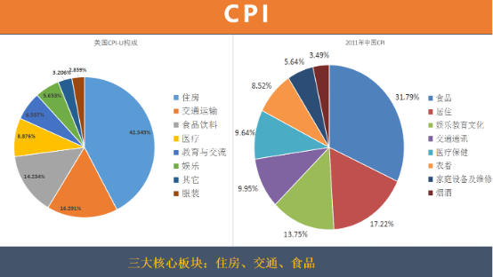 美国的CPI有两项内容,一种是统计工资收入者的CPI-W,另一种是统计所有劳动者的CPI-U,后者覆盖面更广,更受市场关注。CPI-U当中,权重最高的是住房,占比42.34%,其次是交通运输和食品饮料,分别占比16.29%、14.23%。三个类目合计占比72.86%,基本决定了CPI数据的涨跌。中国的CPI构成,根据2011年的数据,食品占比31.79%,居于主导地位。其次是居住,占比17.22%,这里的居住并不包含房价,主要是指租房价格。第三位的是娱乐教育文化,占比13.75%。三个类目总计占比62.76%,基本决定了中国CPI数据的涨跌。可以看出,中国和美国的CPI的前三个类目没有重合,自然不应该将两者拿来简单比较。