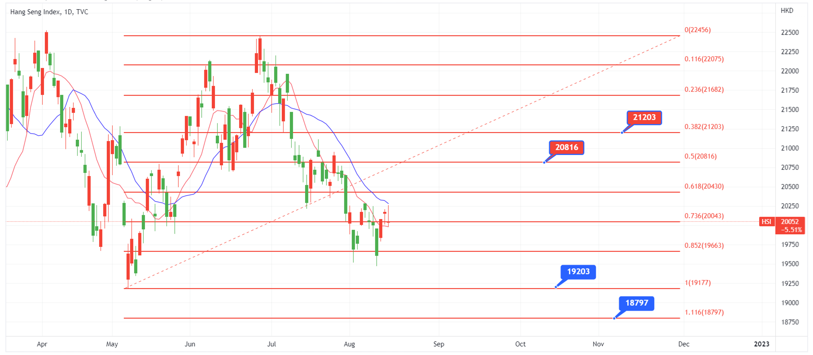 技术上恒生指数走势有机会再次延续跌势, 下探至5月10日低位19,203点, 若突破该点或下探技术性低位18797。周内, 美国多家零售企业财报出炉, 另周三美国公布7月零售销售(6月1%, 7月预期为0.1%)。其后美联储公布7月议息会议纪要, 以上消息可指引美国经济及消费市场, 还有9月美联储议息, 预期对香港恒生指数本周后期的走势间接影响。