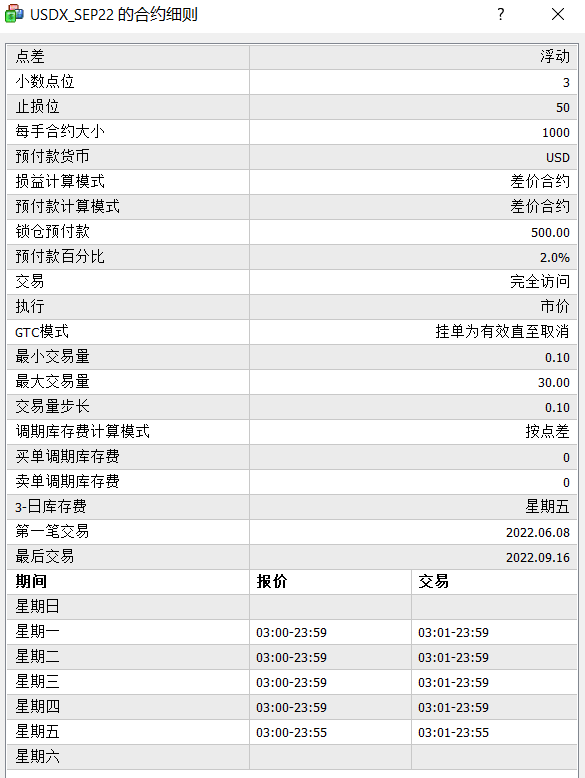 在平台上的美元指数细则中,也可以查看到美元指数的到期日,详细如下图: