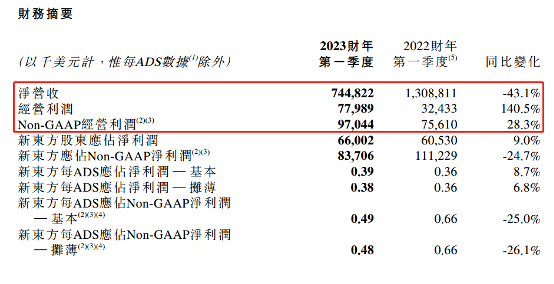 昨日,新东方在港股和美股市场发布了《截至2022 年8 月31 日止第一季度的未经审核财务业绩》公告。其中提到,净营收总额7.44亿元,同比减少43.1%;经营利润7798万美元,同比增长140.5%;非公认会计准则下经营利润97044万元,同比增长28.3%。综合看来,新东方的营收虽然尚未恢复到“双减”政策之前,但盈利能力已经大幅改观。其中的积极变化,主要来自“东方甄选”直播间。