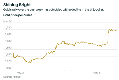 美国10月CPI增速超预期放缓,美元指数大幅跳水的同时,隔夜黄金价格上涨49美元突破1755美元至8月底以来的最高。11月以来,黄金价格已经录得三次大爆发,前两次分别在11月4日和11月8日,单日盘中最高涨幅都超过50美元。