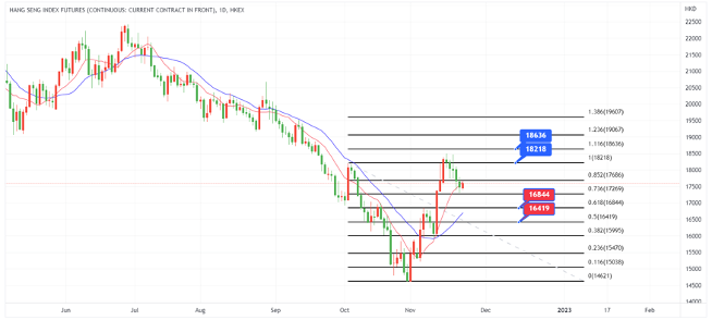 根据国家卫生委员会的数据,中国周三报告11月22日新增29,157例新冠感染,而一天前为28,127例。 北京和上海的病例数稳步上升,促使当局关闭了一些设施, 让投资者不确定新的疫情会在多大程度上减缓世界第二大经济体的重新开放, 对中国股市投资气氛影响, 不过外围因素支持, 国企指数升逾1%, 迫近6000大关, 而上证指数和沪深300指数表现相对较平稳。受周二国际油价上涨推动,个别能源股领涨, 其中港股三桶油股价微升, 其中中国海洋石油表现较佳升逾1.5%, 其他两只股份中国石油股份(HK:0857)及中国石油化工(HK:0386)升1%。周二香港恒生指数金融股及新经济股受市场憧憬美国涨息步伐放慢的预期, 支持相关行业股票表现, 金融股汇丰控股(HK:0005)及友邦保险(HK:1299)升逾0.8%。周二表现较差股份都跟世界足球赛有关的运动产品及啤油股有关, 因受中国新冠病例不断增加, 国内增加力度防控下, 投资者普遍预期相关股份收益下降, 金融机构调低相关股份在四季收入对股价不利。