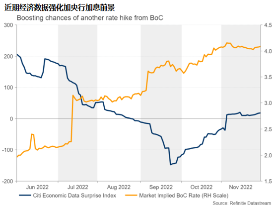 今晚加央行即将进行年底前的最后一次加息,本次市场对于加息的幅度略有分歧,介乎25个基点至50个基点之间,如果是后者,加息至4.25%,或意味着加央行接下来将按下加息暂停键。