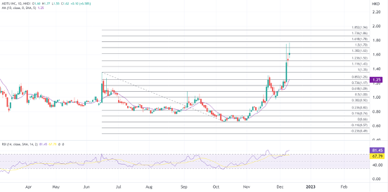 当前股价走势有重蹈此前短炒回落的可能,技术上目前已经处于超买,考虑1.8港元上方阻力,如果这波上涨迎来回调,可能回到1.25下方,并在0.92至1.09寻找支撑。