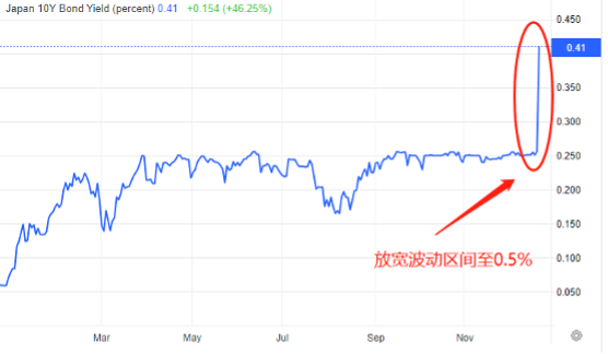 放宽10年期国债收益率的波动幅度,可以更真实的观察到债券市场对货币政策的反应。日本央行利率决议结果公布后,十年期债券收益率“直线式”上涨:开盘价0.24%,上午时段就触及0.469%的波动上限。这表明,市场对于日本央行放弃当前超级宽松货币政策的预期非常强烈。
