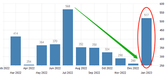 从上图可以看出,2月份的非农就业人口异常放大,严重缺乏连续性。2022年7月份~12月份,美国的非农就业人口从新增56.8万人降低至新增26万人,每个月份减少一部分,数据趋势连续性较强。只有今年一月份数据异常放量、突然走高。这不得不让人怀疑1月份数据存在失真的情况。基于此种判断,本周五的非农就业报告显得至关重要。如果新增非农就业人口降低至20万人以下,表示一月份的非农数据只是短暂反弹,不具有持续性。如果本周五的新增非农业人口依旧维持在50万人高位,则大企业裁员和经济数据良好的矛盾将更为凸显。