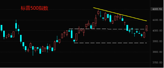 技术角度看,虽然美股实现了两连涨,仍未突破图中黄色中期下降趋势线。由于二月份的回调幅度过大,市场价格已经跌至前一个回调中枢的内部,多头趋势的动能已经被大大削弱。预计市场价格反弹至黄色趋势线附近时大概率出现纠结走势。