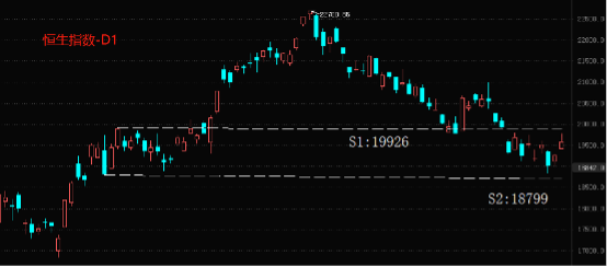 技术角度看,恒生指数中短期空头趋势仍在延续,前期的支撑位S1:19926已经转变为阻力位,第二支撑S2:18799起到了一定的支撑作用,但在趋势性空头面前,或许会很快被击穿。