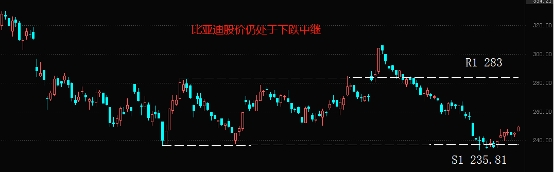 技术角度看,比亚迪股价仍处于显著空头趋势。去年10月28日至今的股价维持宽幅震荡态势。当前市价运行于S1 235.81附近(A股市场),存在触底反弹的可能,短期目标位R1 283元。