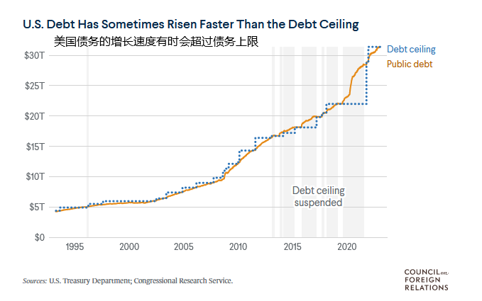 美国国会于1917年设立了债务上限,规定了美国政府可以承担的未偿还联邦债务的最高数额。2023年1月,美国国债总额和债务上限均为31.4万亿美元。自2001年以来,美国政府平均每年的赤字接近1万亿美元,这意味着它的支出远远超过其税收和其他收入。