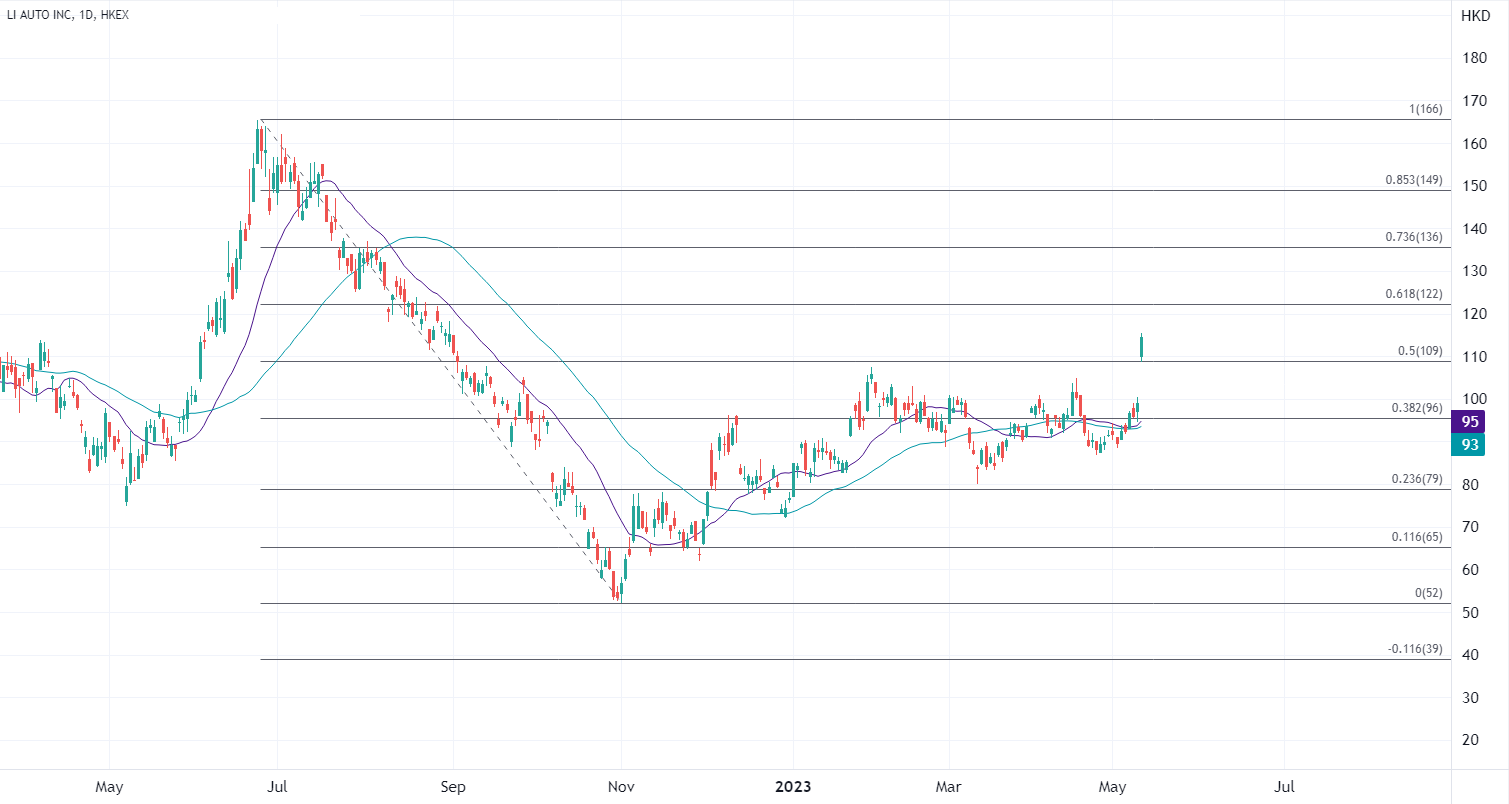 ATFX指出,理想汽车在一季度实现扭亏,净利润增长近两倍,且交付量超预期是股价最大的惊喜,接下来随着新款车型推出有望继续保持较高增长的交付量,销量规模和单车净利有望上升将增强业绩弹性。不过留意股价大幅高开后随着市场消化业绩可能动能放缓,当前股价创下去年8月底以来的高位,接下来阻力在122处,支撑关注109,接下来关注小鹏和蔚来的业绩对比,看能否带来另一波助力。
