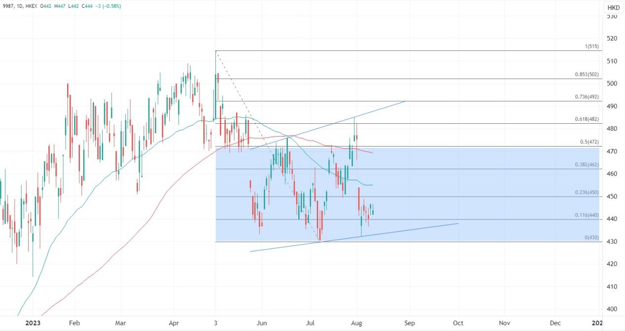 一周前百胜中国公布第二季度业绩后,股价跟随销售额逊预期而下跌,同时投资者也降低对其第三财季的预期,而最新公布的半年报是自2019年以来最优的半年业绩,今日港股股价低开但小幅上扬,连续第二日反弹。技术上处于底部范围,半年报有助缓和期下行压力,不过需要重返50日均线上方重新吸引关注。在更多的同店销售数据公布前,股价可能维持自6月份以来的主要区间内交投。