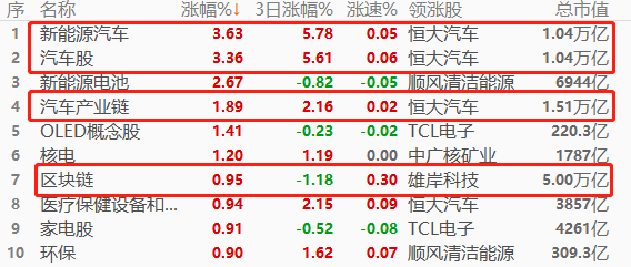 板块角度看,新能源汽车以3.63%的幅度领涨,其次是汽车股和新能源电池。涨幅榜前十当中,万亿市值板块仅占4席,占比一般,对指数的带动作用一般。与“汽车”相关的板块有4席,形成今日的交易主线。港股三大权重板块:银行、互联网、房地产的涨跌幅分别为-0.22%、-1.08%、-0.01%,普跌但跌幅较窄,对恒指形成一定程度拖累。