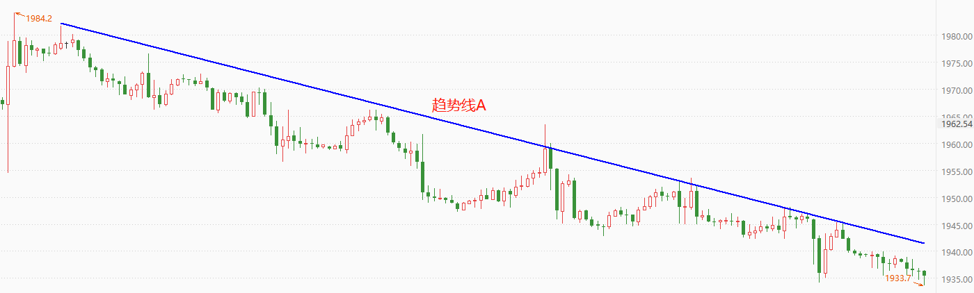 H1级别,黄金空头趋势显著,趋势线A对市价形成完美压制。投机性空头时机:在市价反弹至与趋势线A交叉之时。一旦市价反弹至趋势线A上方,且出现连续阳线,则趋势线的完美压制作用消失,趋势发生转折。持空期间,可以RSI震荡型指标为依据,择机平空止盈。