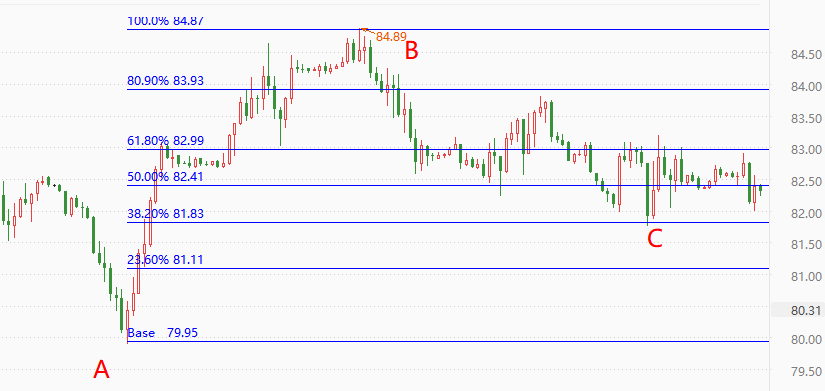 H1级别,原油形成A-B-C的上涨后回调结构,回调低点C刚好处于0.382黄金分割位置。经验看,C点的支撑作用较强,有可能触发新一轮反弹。C点至今的K线横向排列,投机性多头力量不足,或因为日线级别刚刚突破重要阻力位的缘故。自C点开始的反弹仍未结束,存在重归高点B的可能。假若C点在本周被突破,则回调延续,下一个支撑位在0.236分位处。