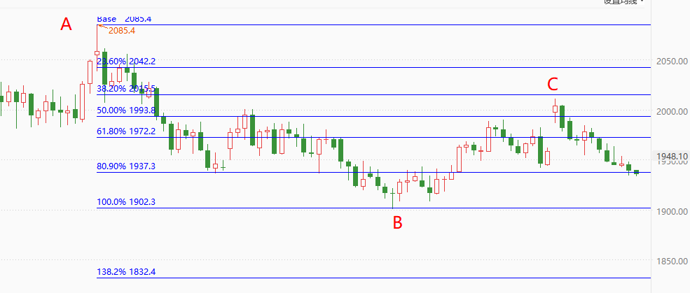 A-B-C三个节点,构成5月至今的黄金日线主体结构。B-C的反弹波段,C点是最高点,介于0.5~0.382区间内,具备一定程度的反转特征。C点至今的回撤,累计跌幅近4%,持续时间长达两周,对投机性多头的热情冲击较大。B点是中线支撑,市价约接近B点,投资性空转多的买入力量越强。如果B点被突破,则趋势判定为空头延续,行情重回C点的可能性大降。