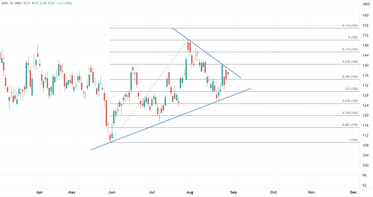 今年以来,美团股价自年初高位已经累计跌超过30%,跌幅在科技指数成分股中靠前。周一股价跟随大市跳空高开后倒跌,技术上也在形态顶部遇阻,所以关注重回134港元下方寻找支撑。