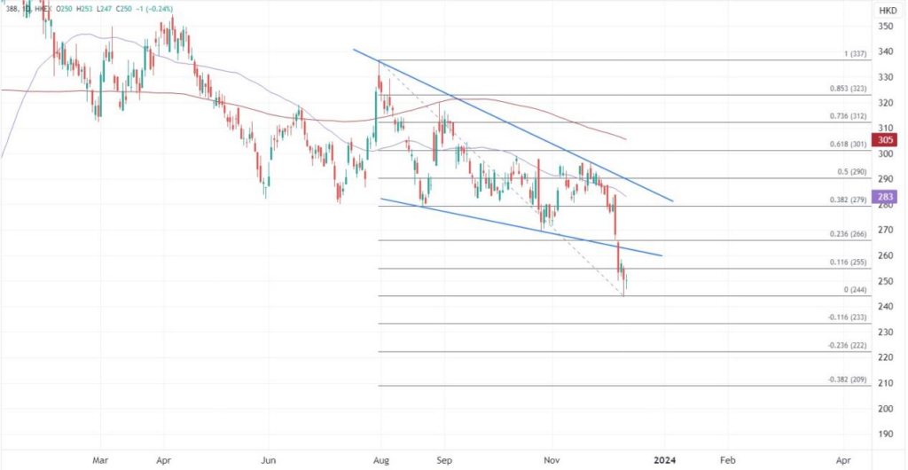 作为和港股走势密切相关的股票,港交所自2021年触顶后,股价已跌去一半,目前的市盈率为27.7倍。在年底前市场观望港股在低位是否能迎来反弹,如果明年经济能如预期改善,可以重新带来流动性以及估值回升。如果其核心业务暂时未能有所突破,则关注其投资收入是否有足够的动力。当前股价维持逾一年最低,如果跌破230港元,前低在209处可以带来支撑。