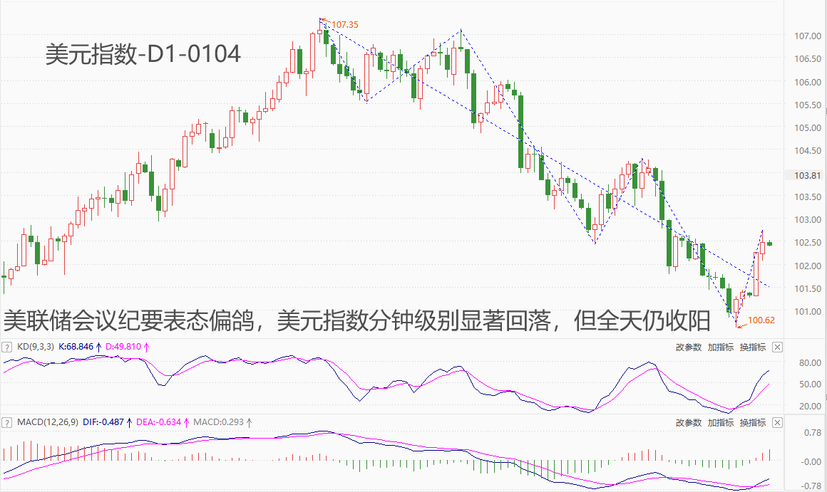 今日凌晨3点,美联储发布12月货币政策会议纪要,其中提到:政策利率可能处于或接近本轮紧缩周期的峰值,实际的政策路径将取决于经济如何发展;过度限制性立场可能给经济带来下行风险;2024年降息的可能性很高,但利率路径高度不确定。从与会者的发言来看,会议纪要的整体态度偏向鸽派,因为其中提到了“紧缩周期峰值”“经济下行风险”“2024年降息”等关键词。事实也符合我们的判断:美元指数在会议纪要发布后,五分钟级别,连续收出三根长阴线,由于亚盘和欧盘美元指数涨幅较大,所以美盘时段的回落只形成了全天阳线的长上影。虽然2024年降息已经是大概率时间,但开始降息的月份却无法确定。市场主流预期认为今年3月份美联储就会开启第一次降息,这一观点偏向激进,比较稳妥的看法是今年上半年美联储将有一次降息动作。