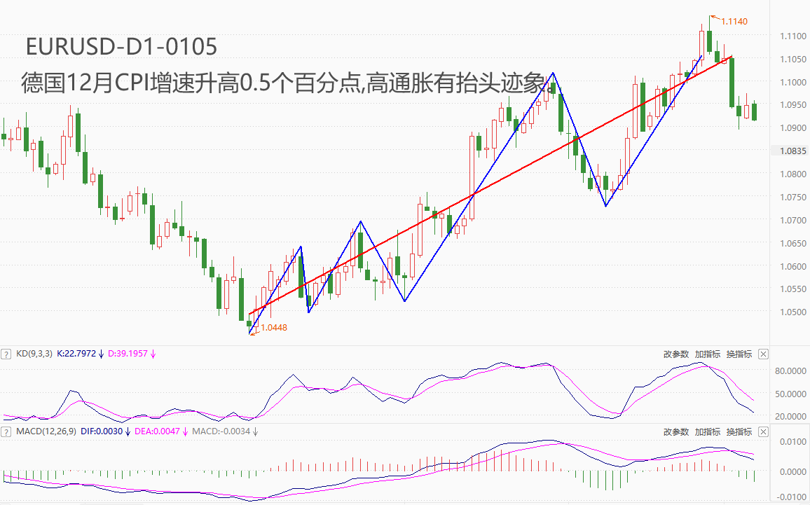 据德国联邦统计局昨日发布的数据,德国12月CPI年率初值3.7%,前值为3.2%,最新值高出前值0.5个百分点,这是2023年6月份以来的首次升高,部分媒体惊呼“欧洲高通胀恐卷土重来”!环比数据看,德国11月份CPI月率为-0.4%,12月份最新值0.1%,由负转正,同样意味着通胀有抬头迹象。德国是欧洲的经济引擎,同时也是欧洲的经济走向风向标,如果德国通胀率重新走高,欧元区也无法避免新一轮的高通胀。通胀率走高意味着欧央行将推迟降息的时间点,甚至于通胀率过高的话,还会重启加息。昨日,EURUSD升值0.22%,就是对德国CPI数据的反应。
