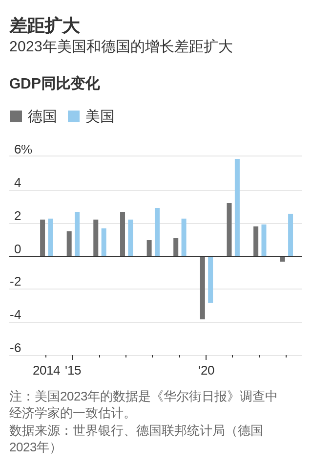经通胀调整后,德国2023年的GDP仅比2017年底增长了1%。相比之下,根据欧盟统计局和美国经济分析局的数据,同期美国经济经通胀调整后增长了13%。