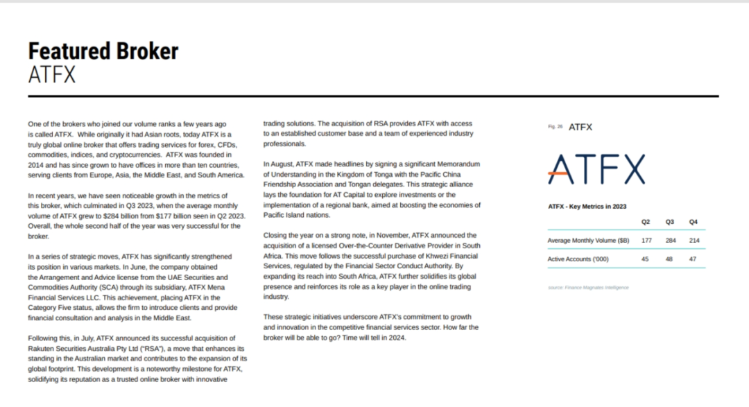 最新公布的Finance Magnates 2023年第四季度行情报告中,ATFX多个数据上榜,并获得傲人的成绩。