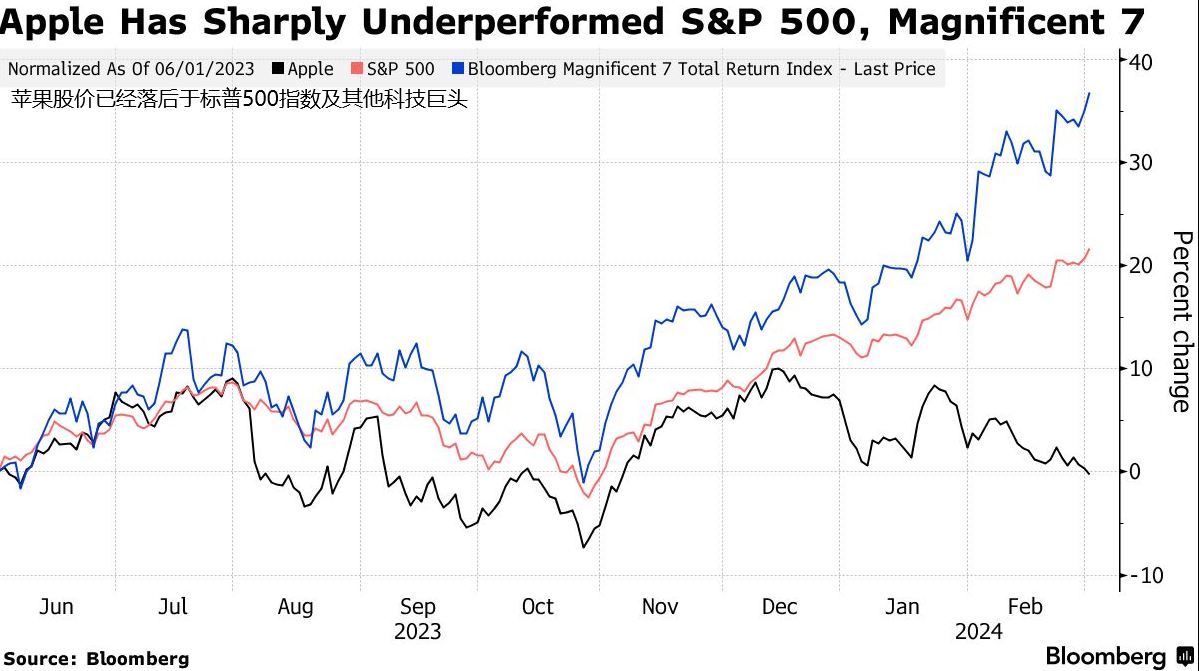 1月份,苹果作为市值最高公司的头衔也被微软取代,因其销售和利润增长远远超过了苹果。FactSet的数据显示,尽管苹果的长期回报率超过市场,但最近在6个月、1年和2年的时间范围内,苹果的表现都落后于标准普尔500指数。