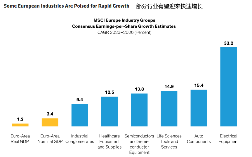 根据市场普遍预期,到2026年,包括工业、半导体和电气设备在内的几个欧洲行业将实现强劲的盈利增长,这些行业的增长速度将远远超过欧元区温和的GDP增长预期。因为截止2023年,MSCI欧洲成分股公司60%的营收来自欧洲以外地区——在非国内销售中所占比例远高于美国、日本或新兴市场的公司,因此其对欧元区经济增长的依赖并不高,所以对于长线股票投资者来说具备长久持有的估值吸引力。