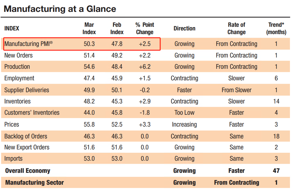 昨日,美国供应管理协会发布数据:美国3月ISM制造业PMI最新值50.3,显著高于前值47.8,高于预期值48.4。PMI数据的荣枯线是50,高于50意味着制造业处于扩张状态。要知道,2022年11月以来,美国的ISM制造业PMI一直处于荣枯线下方,意味着制造业长期处于收缩态势,分析人士也将该数据看做美国经济将“硬着陆”的关键证据。3月ISM制造业PMI的意外转好,意味着美国的制造业正在复苏,经济衰退的可能性大幅下降。