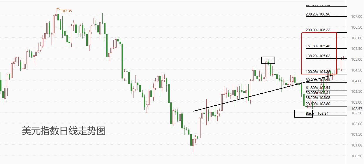 上图为美元指数的日线级别走势图。与主流的降息预期不同,3月份以来美元指数持续走高,价格从102附近涨至当前的105关口,期间几乎没有出现明显回调。尤其是昨日的长阳线,令中短期的涨势加速,后市极有可能触及重要阻力位106.22。当然,在此之前,次要阻力位105.48也需要重点关注。