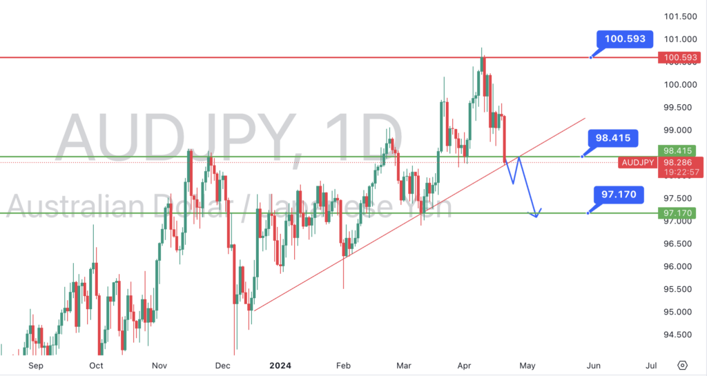 澳元兑日元一直在形成看涨的走势,创造更高的高点和更高的低点。然而,看跌动能依然强劲,短期趋势可能会暂时改变,并可能突破支撑位。如果澳元兑日元跌破当前的支撑位,可能探索下一个支撑位在97.170。