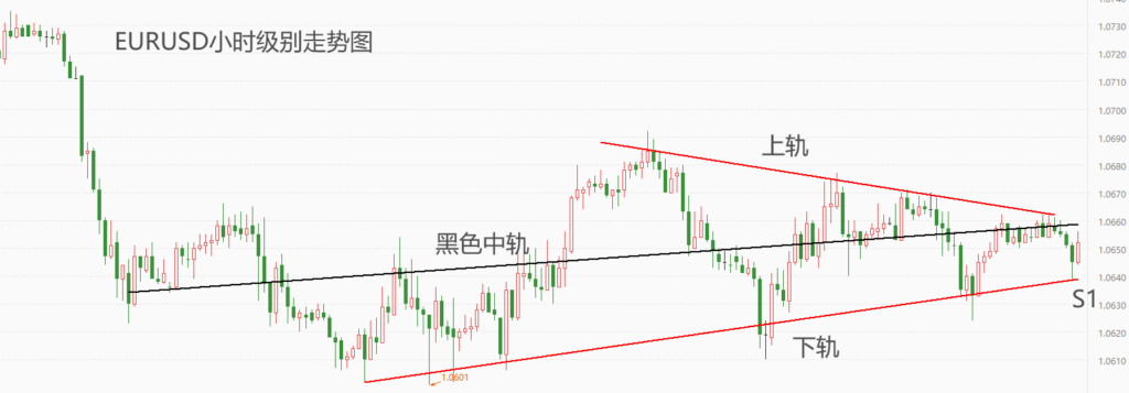 上图为EURUSD小时级别走势图。最近的200根K线来看,市价处于横盘震荡态势,且震荡态势存在收口迹象,一旦收口达到极限,单边走势即将出现。考虑到EURUSD日线级别处于空头趋势,且美元指数近期表现强势,预计未来的单边走势,向下突破的概率较高。回到小时级别的分析,当前市价处于上轨与下轨之间,距离上轨较近,日内触顶回落概率较高。