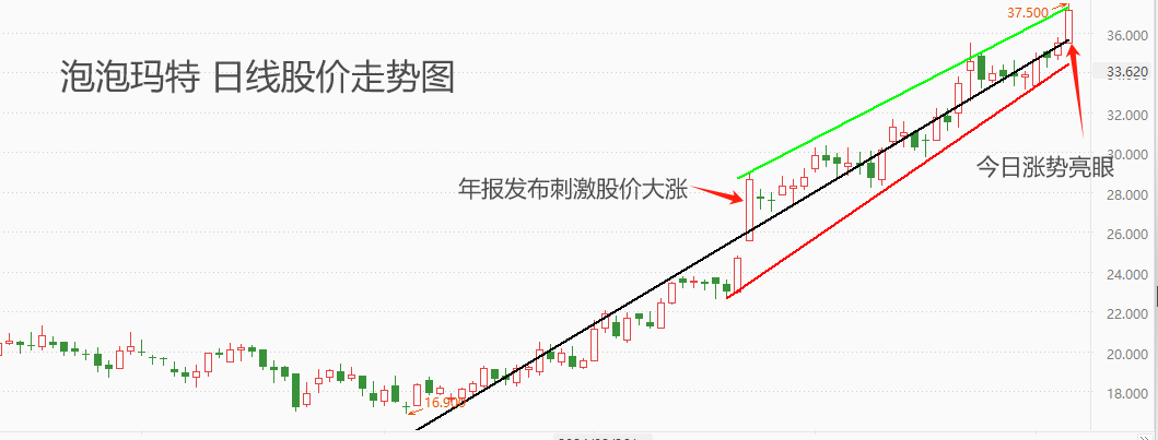 今年2月5日,泡泡玛特回调至16.9港元后止跌回升,5月20日发布亮眼财报后刺激股价连续大涨两日,累计涨幅24.57%,经过一段时间的温和上涨后,今日再迎5%左右的涨幅,最高触及37.5港元,创出年内新高。今年以来,泡泡玛特从20港元涨至今日37港元,累计涨幅85%,位列港股市场年度强势股排名前列。技术角度看,泡泡玛特的日线股价处于快速上涨趋势,不过,市价已经触及图中绿色阻力线,后市存在小幅回调压力。图中红色线是中长期支撑位,其与黑色中轴线一起对行情形成支撑,预计回调走势不会破坏上涨结构。