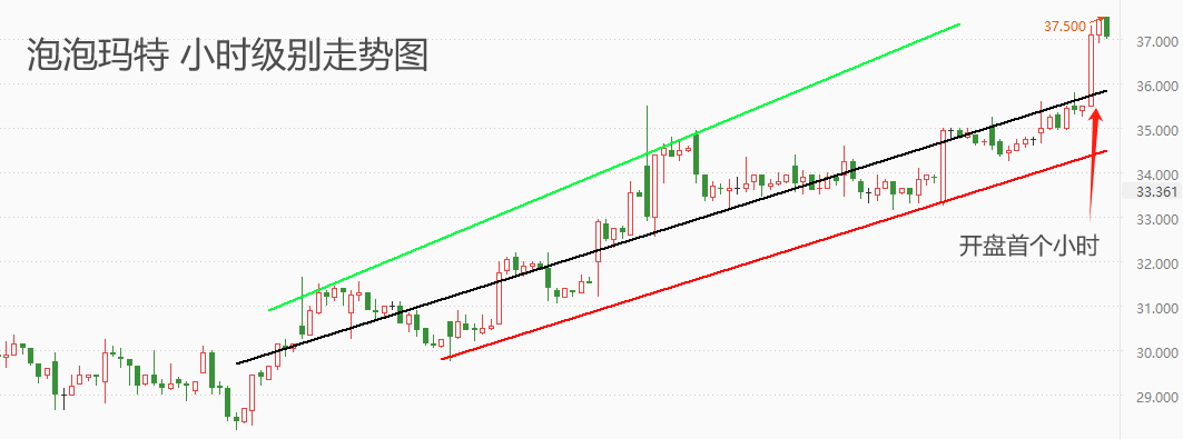 短周期来看,泡泡玛特的上涨走势与日线级别一样稳健。今日开盘后的首个小时,股价上涨4.5%,之后的两根K线一阳一阴,有高位震荡特征,警惕下午筑顶回落走势。图中绿色线为中期阻力线,目前距离市价较远,对行情走势影响较弱。红色线为中期支撑线,如果回落走势开启,市价可能在34.5处获得支撑。黑色线为上涨走势中轴线,市价围绕该中轴上下波动。本轮上涨虽然尚未触及绿色阻力线,但已经偏离中轴线较远,可能会向中轴线回归。