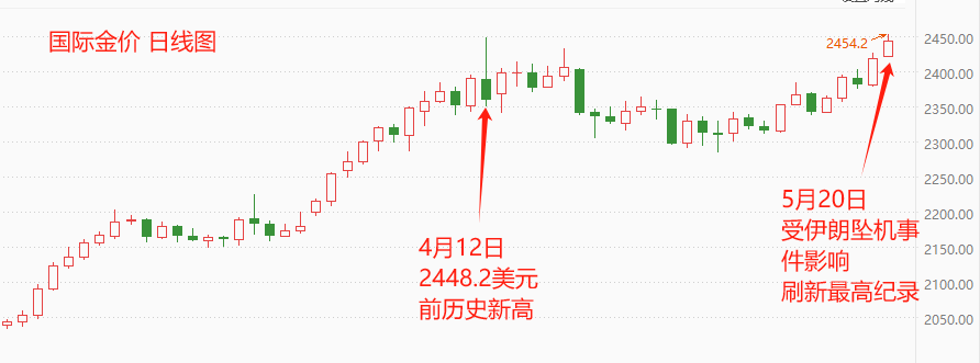 据外媒报道,当地时间19日下午,一架载有伊朗总统、外长以及其他随行人员的直升机在发生硬着陆事故,事后查明机上全员遇难。该事件导致全球避险情绪迅速升温,本已进入回调阶段的国际金价受益走高,至北京时间13:35时,国际金价突破4月份最高点,刷新历史最高点纪录。