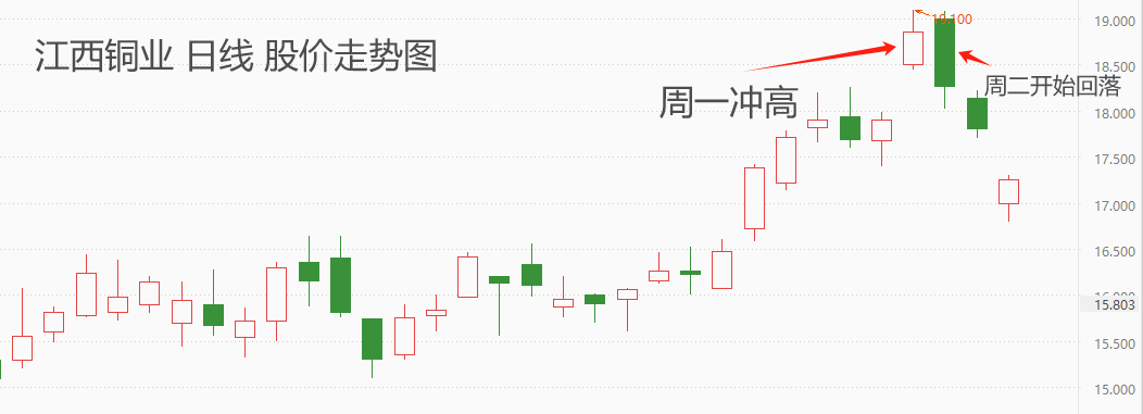 本周一,COMEX铜价格冲高至5.19美分,创出十多年来新高。周二,铜价维持高位震荡态势。周三,COMEX铜大跌5.99%,单根K线吞没此前六根K线的涨幅吗。截至今日上午盘,铜价温和波动,下午盘有继续下跌的可能。受铜价剧烈波动影响,以铜、金、银、铅等矿产开发为主营业务的江西铜业,股价出现先涨后跌的特征。周一最高价为19.1港元,距离20港元整数关口仅一步之遥。如果未来COMEX铜价跌势延续,江西铜业的19.1港元有可能成为中期高点。