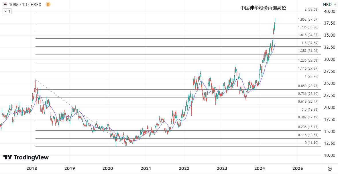 原本在周三走强的煤炭股在昨日基本是集体挨沽,蒙古能源(00276)挫6%;南戈壁(01878)跌5.2%;中兖煤澳大利亚(03668)跌3.2%;兖矿能源(01171)跌2.4%;中煤能源(01898)跌2.7%,今日同样部分自昨日的跌势中收复部分失地,中国神华(01088)昨日下跌1.8%后今早重新反弹2.8%继续创下新高位。