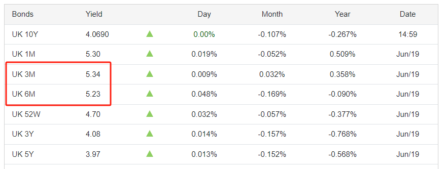 答案是:国债市场还未给出明确的降息信号。英国3个月期国债收益率为5.34%,6个月期国债收益率为5.23%,长期国债收益率低于短期国债收益,出现倒挂现象,倒挂区间为11基点。倒挂现象意味着英央行首次降息的时间点将会在3个月~6个月之间,也就是今年的9月份至12月份。如果6月份的利率决议降息,应当是1个月期和3个月期的国债收益率倒挂才对。事实显然不是如此,所以6月降息的概率不高,市场主流预期认为的“保持基准利率不变”是对的。