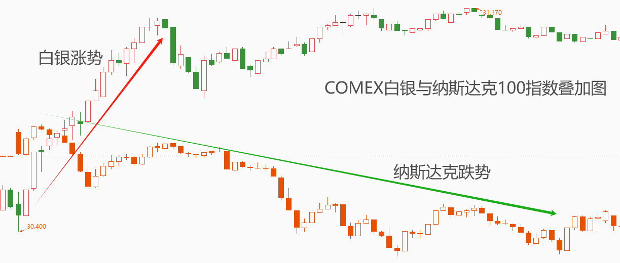 美股夏令时开盘时间为北京时间21:30,意味着美国的交易资金在这一刻开始扰动资产价格。昨日美股开盘后,伦敦银随即开启涨势,直至当日23:05,触及日线高点30.76港元,随后进入震荡模式,当日收盘价30.71,站上30美元关口。为什么这段时间伦敦银能够出现飙涨走势?答案是:同期的美股大跌。昨日,美国纳斯达克100指数下跌0.79%,主体跌幅与伦敦银的主题涨幅重合,可以对伦敦银的上涨做出合理解释。