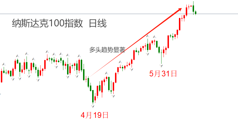 4月19日,纳斯达克100指数跌至阶段性低点,当时金融市场对于美联储降息的预期跌至冰点。随着5月份公布的非农数据和CPI数据爆冷,纳斯达克100指数触底反弹,截至今日累计涨幅超过15%。由于纳斯达克100指数在不断刷新历史最高价纪录,所以我们并不能准确判断其有效阻力位在历史上的位置。这种局面之下,K线的形态和组合结构就成为研判顶部何时出现的关键指标。如昨日一般的长阴线,以及今日即将跌破前一日低点的小阴线,意味着顶部极有可能在最近几个交易日形成。恐慌情绪蔓延之下,黄金和白银价格受益。