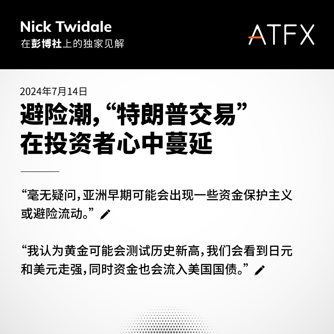 风暴眼中,黄金、美元等资产将如何变幻,ATFX首席市场分析师Nick Twidale受邀就“特朗普遇刺”事件在彭博社发表自己的看法。
