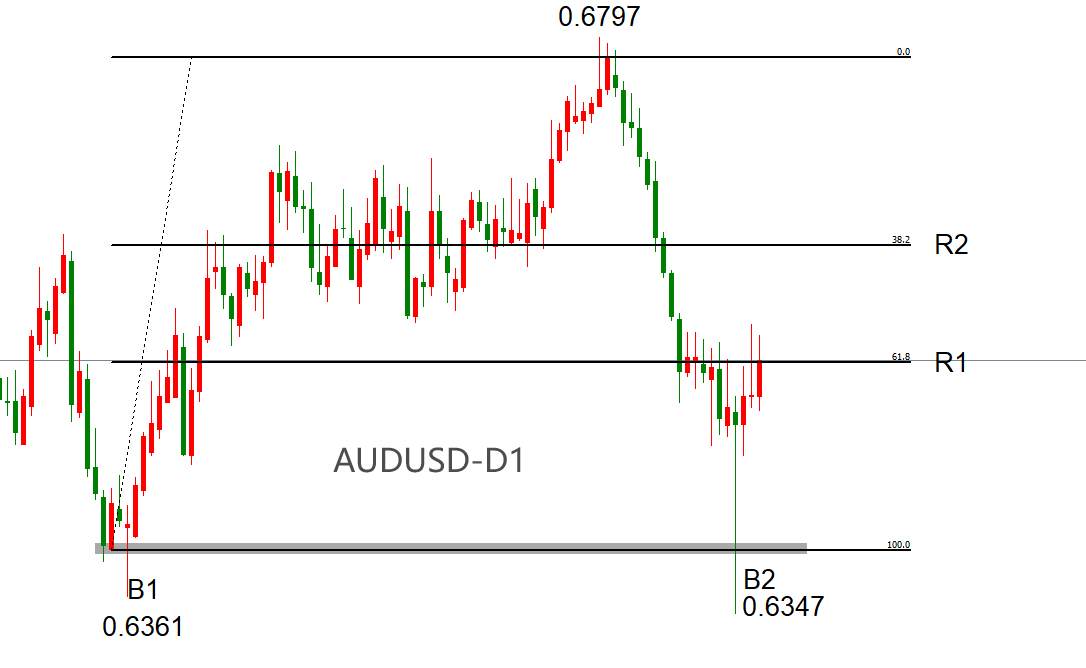 8月5日,伴随着美元指数的剧烈下跌,AUDUSD波动性迅速增大,当日以长下影K线收盘,最低触及0.6347。4月19日,AUDUSD也出现阶段性低点0.6361,该低点与8月5日的低点相差仅14基点。技术角度看,8月5日的低点B2和4月19日的低点B1构成双底结构,未来行情可能出现同等级别的反弹。AUDUSD最新市价0.6454,处于0.382的黄金分割位置处,如果阻力位被有效突破,下一个阻力位R2将接受考验,该点位处于0.618的黄金分割为,阻力作用更强。