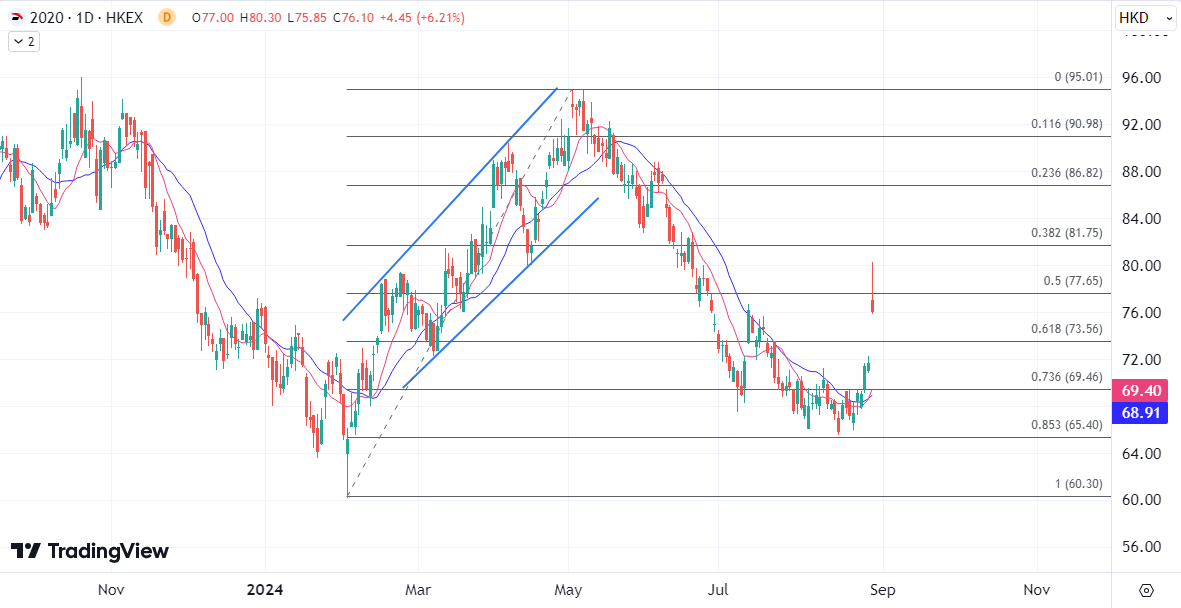 即便是在消费市场依然处于增长欠佳的状态下,国产运动品牌多数步入“调整期”的增速放缓,多品牌布局的安踏仍实现“全面开花”,零售额同比实现增长,带动了上半年的营利双增,录得最佳半年业绩,而推进百亿元回购计划更是带动市场对于集团业绩和股价前景的信心,而业绩显示安踏正在加大运动科技研发,有望继续通过优化产品性能带来更大的市场份额。当前股价在短暂测试80港元后回吐,若日内收低于76港元,则留意可能进一步回撤至75-70港元范围。