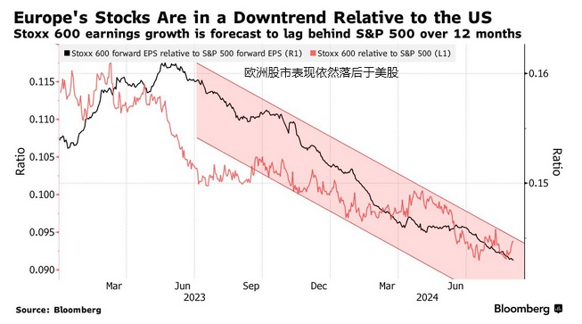 不过有迹象显示,在经历了一段短暂的跑赢期后,欧洲股市相对于美国股市获得优势的希望正在消退,原因是对经济放缓的担忧给企业盈利前景带来压力。斯托克600指数在8月份的表现仍逊于标准普尔500指数,该指数在2024年迄今已落后近9个百分点,连续第二年表现欠佳。