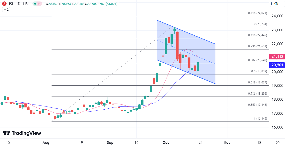 港股此前连跌四日的同时成交量也跟随连缩五日,今日跟随内地乐观经济数据,自9月底低位回升,收复部分失地而重返20日均线上方,险些回补9月底缺口,配合两万点关口的支撑缓和当前压力,但要重拾技术面信心则需要继续突破10日均线回到21100上方。