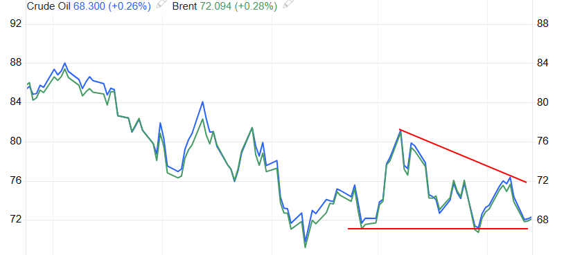 从美原油和布伦特原油的叠加图可以看出,两者走势共振性极强,技术走势基本相同。9月初以来,两者保持不规则震荡态势,直至10月初触顶回落后,才呈现出下降三角形的结构。由于三角形被定义为“顺周期信号”,所以三角形震荡完成后,美原油和布伦特原油价格双双下跌的概率较高。9月份的低点美原油65美元、布伦特69美元可以看做三角形突破是否有效的标准。