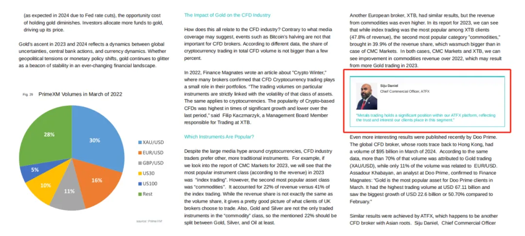 在此次的报告中,Finance Magnates还邀请了ATFX首席商务官Siju Daniel就目前市场热门品种黄金进行重要分析。其中他就曾阐述,贵金属交易在我们的平台中占有重要地位,反映了信任我们的客户对这一领域的强烈兴趣。在2024年第一季度,我们总交易量的70%归因于贵金属交易。