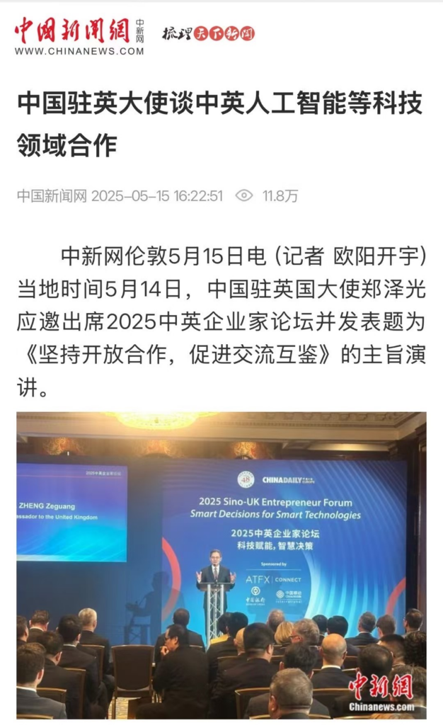 中国驻英国大使郑泽光出席论坛并发表题为《坚持开放合作,促进交流互鉴》的主旨演讲。他强调了国际合作对于人工智能发展的重要性,呼吁共同构建开放包容的市场发展环境。英国48家集团主席杰克·佩里则指出英国应在吸引人工智能投资方面提供互补价值,并积极评价了中国在全球舞台上的角色。