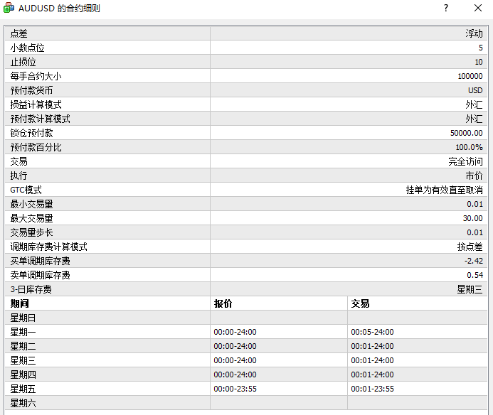 1手AUDUSD的价值是10万美元,波动一个基点的价值为10美元,亦即点值为10美元。最小交易单位0.01手,对应每基点的价值为0.1美元,最大单笔交易单量30手。100倍账户组下,一手保证金为1000美元,200倍账户组下,一手保证金500美元,400倍账户组下,一手保证金为250美元。最小点差2.5基点,在交易一手单的情况下,点差费25美元左右。由于AUDUSD是两种货币的兑换,所以存在调期库存费(隔夜费)。以目前的环境看,买单调期库存费为负值,意味着买入AUDUSD(用美元兑换澳元)需要付出隔夜费(因为美元利率更高);卖单调期库存费为正值,意味着卖出AUDUSD(用澳元兑换美元)可以获得隔夜费(同样因为美元利率更高)。调期库存费的计算模式均为按点差(小点)。交易时段为周一的5:05至隔天05:00,工作日全天24H交易,周六4:55收盘。