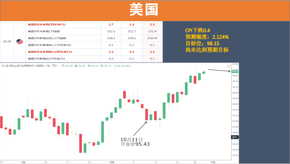 上图是通过神奇数字对美元指数10月份走势的前瞻预测,目标位在98.15,当时美指市价96.71,原味达到预期值。到目前为止,美元指数最高实现了97.2的峰值,与预测值仅仅相差0.95,可以说是相当精确。